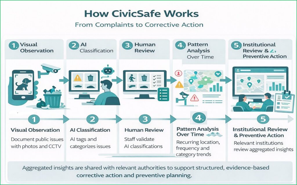CivicSafe is a structured observation and pattern-analysis framework that helps institutions move from isolated complaints to data-informed corrective action.